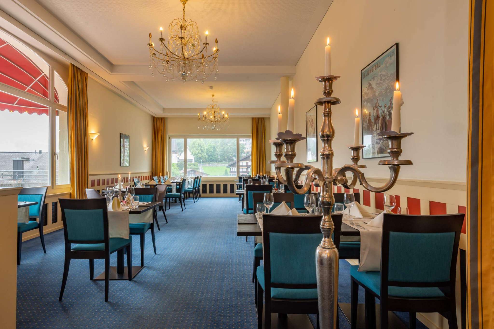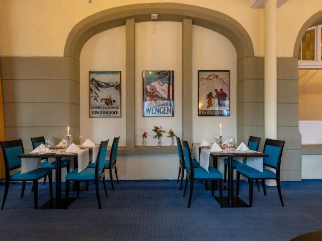 Ein ausgewogenes Frühstücksbuffet wartet morgens im Speisesaal – mit Sicht über das Lauterbrunnental – auf dich. Abends wird dir ein 4-Gang-Wahlmenü (vor Ort wählbar) serviert. Das Abendessen wird täglich mit einem Vorspeisenbuffet mit Salat und Suppe eröffnet. Einmal pro Woche erwartet dich zudem ein genussvolles Dessertbuffet mit hausgemachter Patisserie.
