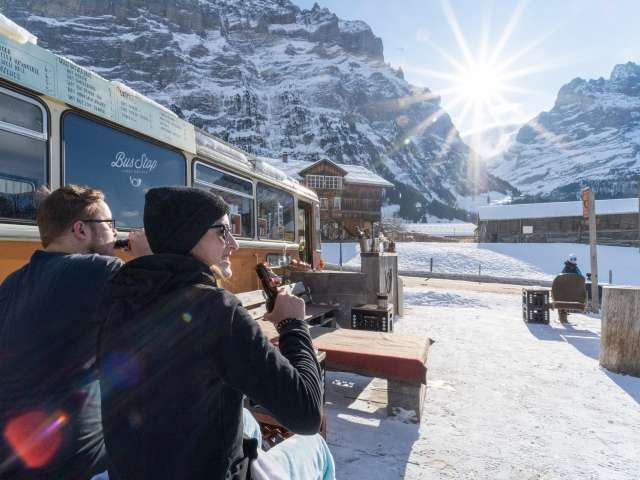 A bar in a bus from the 1960's. At the end of the Grindel valley run, you ski or snowboard directly to the bus stop. The bar is a journey into the past. An unmistakable atmosphere with charm and flair. Come by and try the exclusive Motorenöl coffee, a Gingerbomb or the hot Mojito.