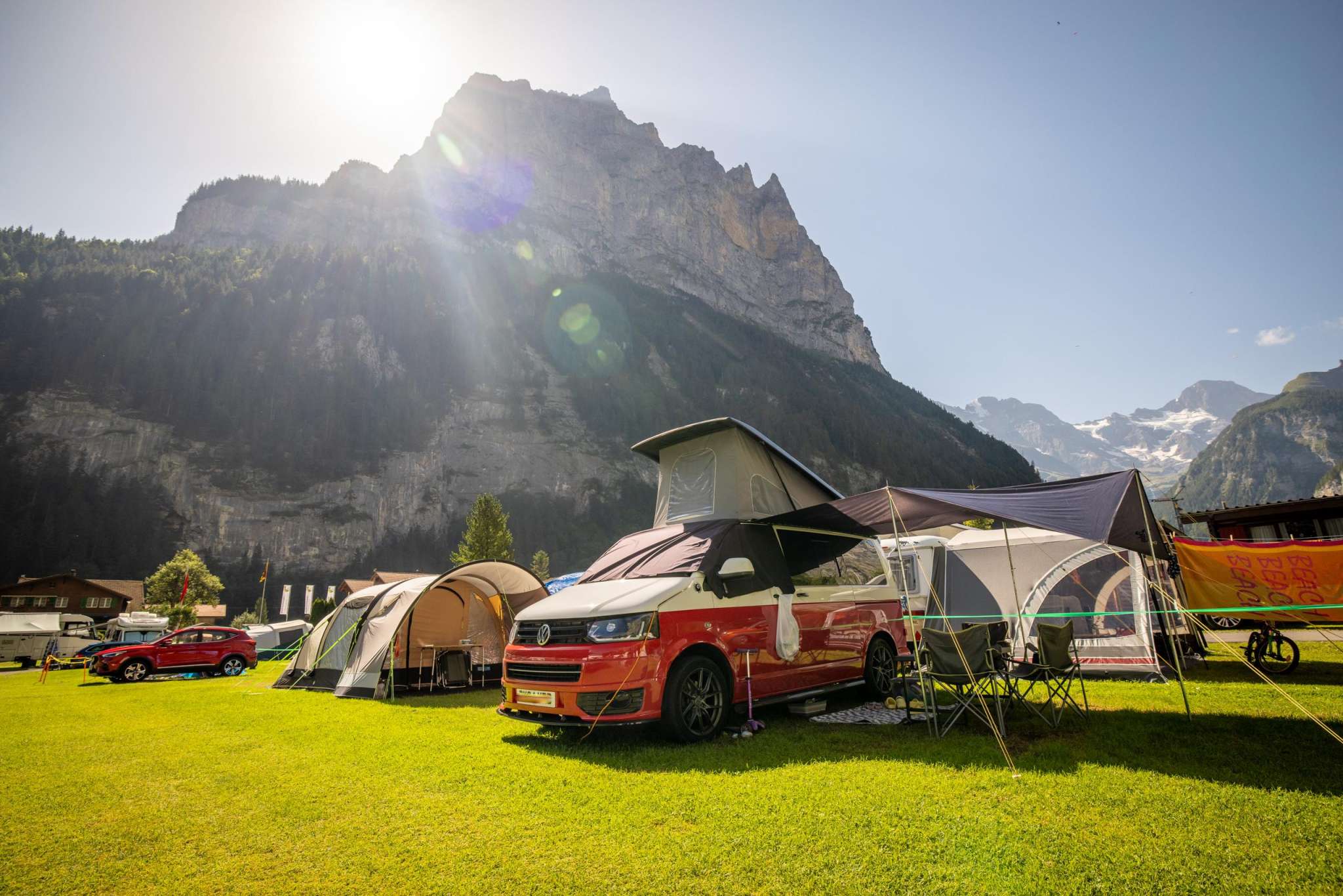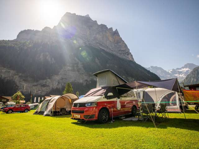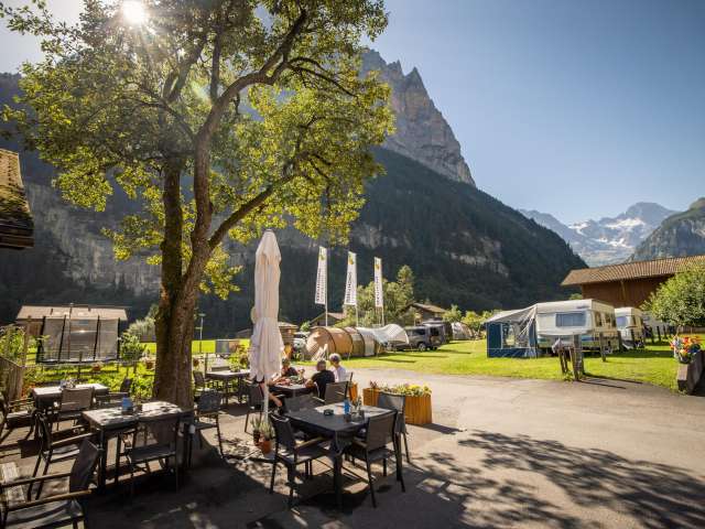 Our campsite is ideally situated right next to the bus route and is the perfect starting point for unforgettable adventures. In just a few minutes, you can reach the Schilthornbahn, which takes you to the idyllic mountain villages of Gimmelwald and Mürren. From there, spectacular hikes and the ride up to the legendary Piz Gloria await – the revolving restaurant offering a breathtaking 360° panoramic view of the Alps.
