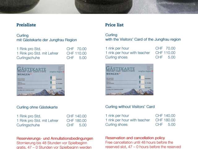 Around 30 curling cups are organised in Wengen every winter - just come along and watch the pros at work. "Curling for everyone" is offered for beginners. You will be taught how to play curling under expert guidance. Fun for everyone!