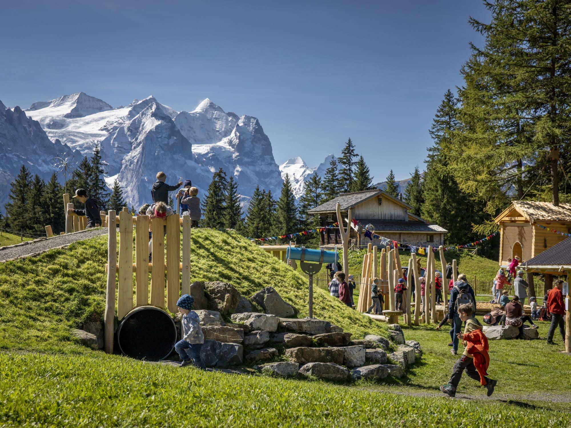 The Bidmi dwarf playground is located at the sunny Bidmi middle station in Hasliberg, directly on the mountain railway line from Reuti to Mägisalp. Inspired by the mythical Hasli dwarfs, it is lovingly designed with wooden huts, climbing towers and slides. Children can immerse themselves in the fantasy world of dwarves, experience adventures and discover nature. Meanwhile, parents can enjoy the magnificent view over the Haslital valley and the surrounding mountains.
