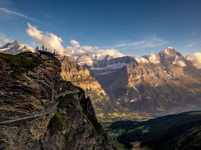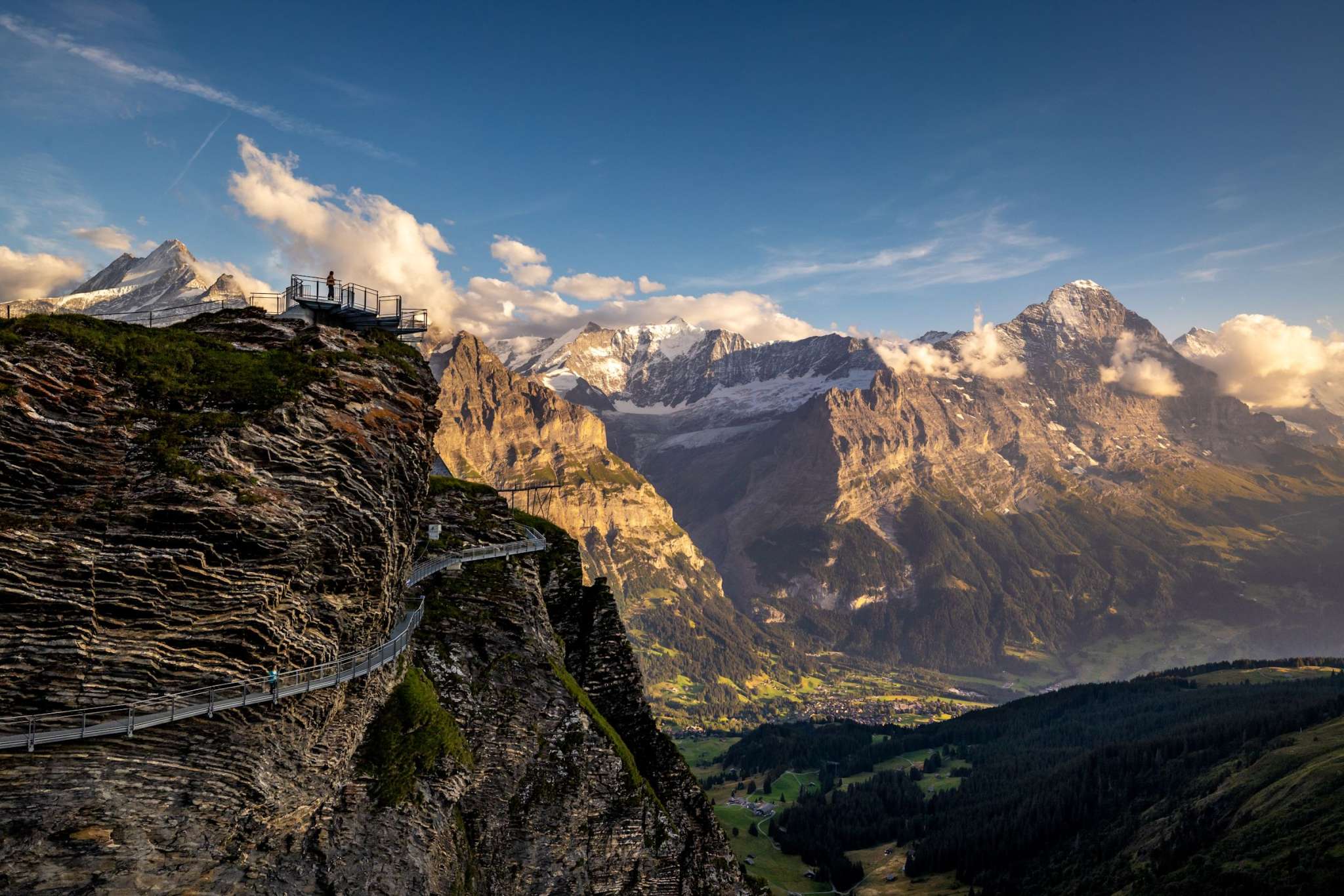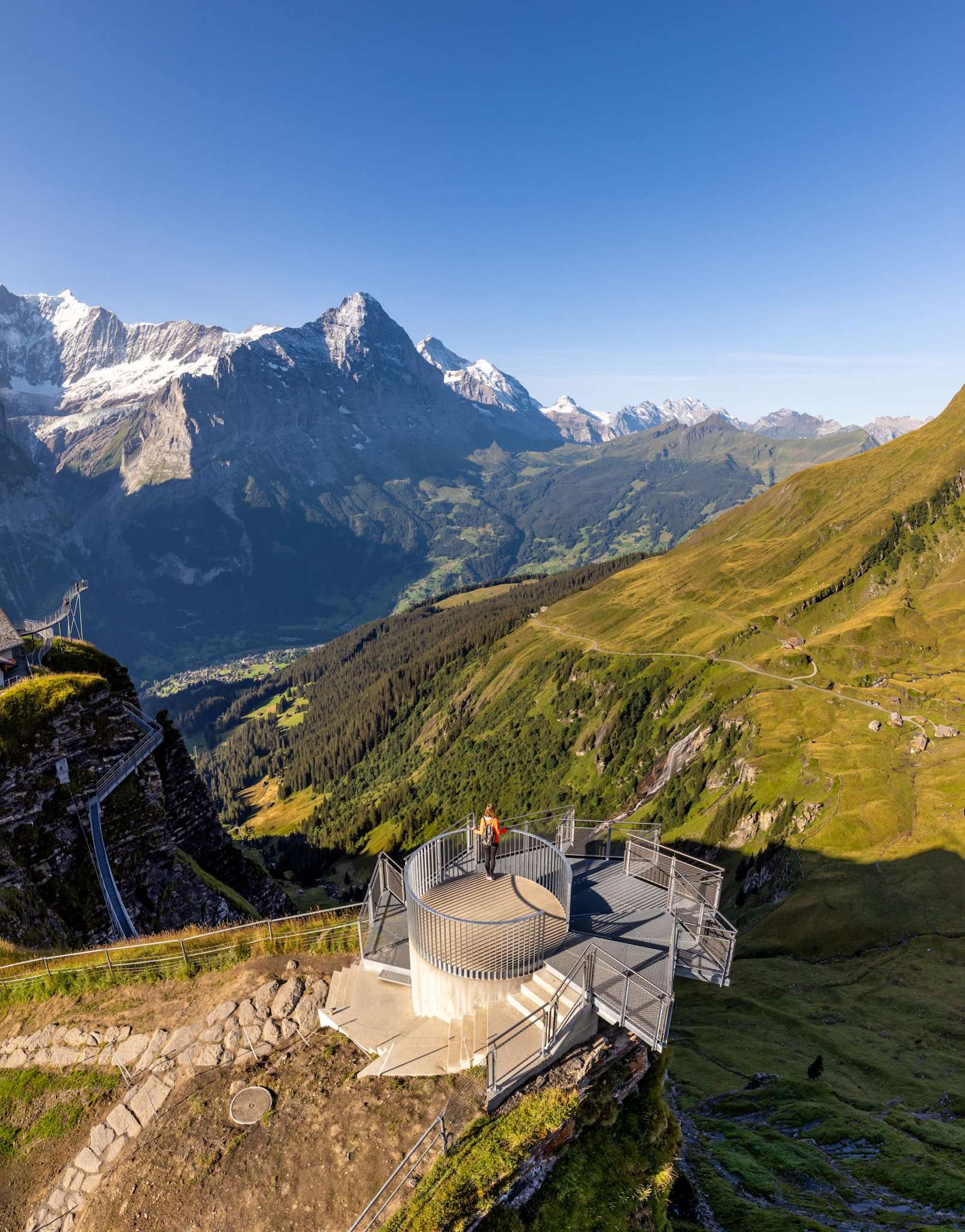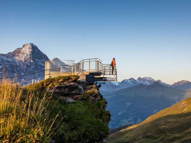 A short walk leads from the First mountain station to the slightly higher metal building in the shape of a windmill. After the entrance, each of the seven “rotor blades”, which are offset in height, focuses on a particular section of the Alpine ring: from the highest peaks of the Bernese Oberland to the world-famous Eiger North Face and the skiing and hiking mountains around Grindelwald. Various seating options invite you to linger and marvel. Those in search of a little thrill will find it next door on the First Cliff Walk by Tissot or on the two Flying Fox variants, the First Flyer and First Glider.