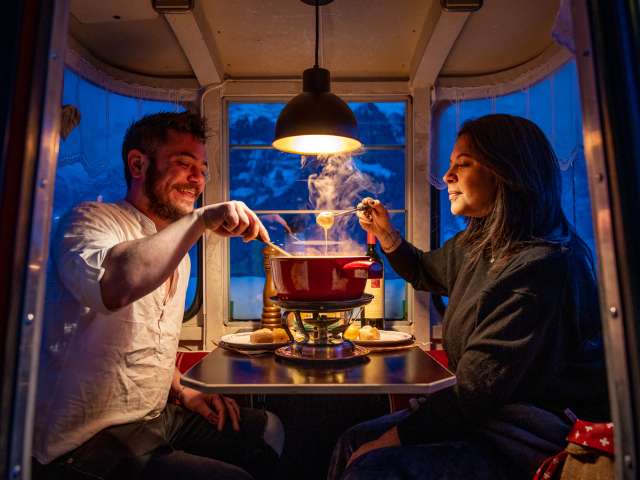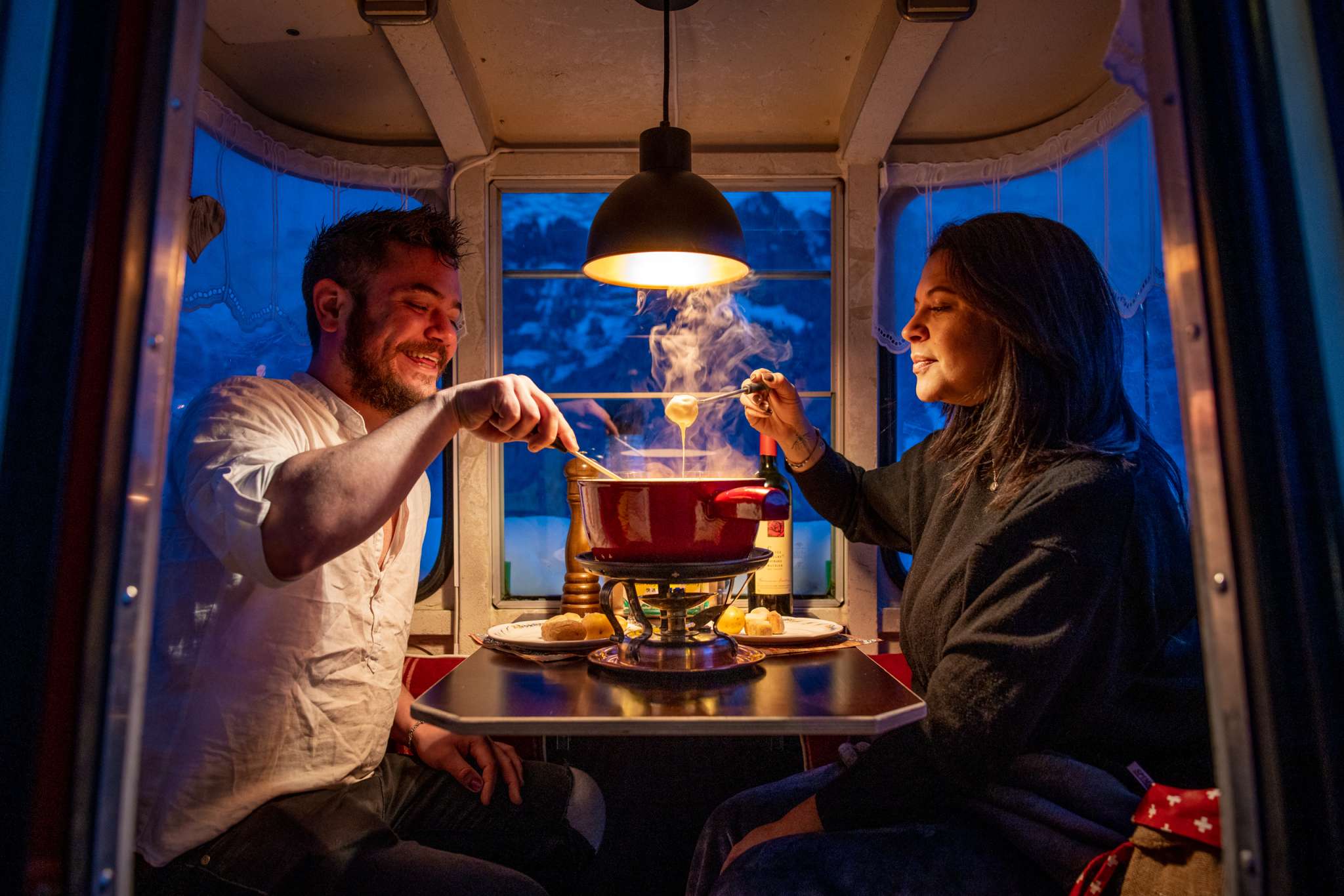 Simply to melt away: classic Swiss cheese fondue, served outdoors in the cosy gondola at the Hotel Belvedere Grindelwald. So don't forget to put on warm clothes in winter.