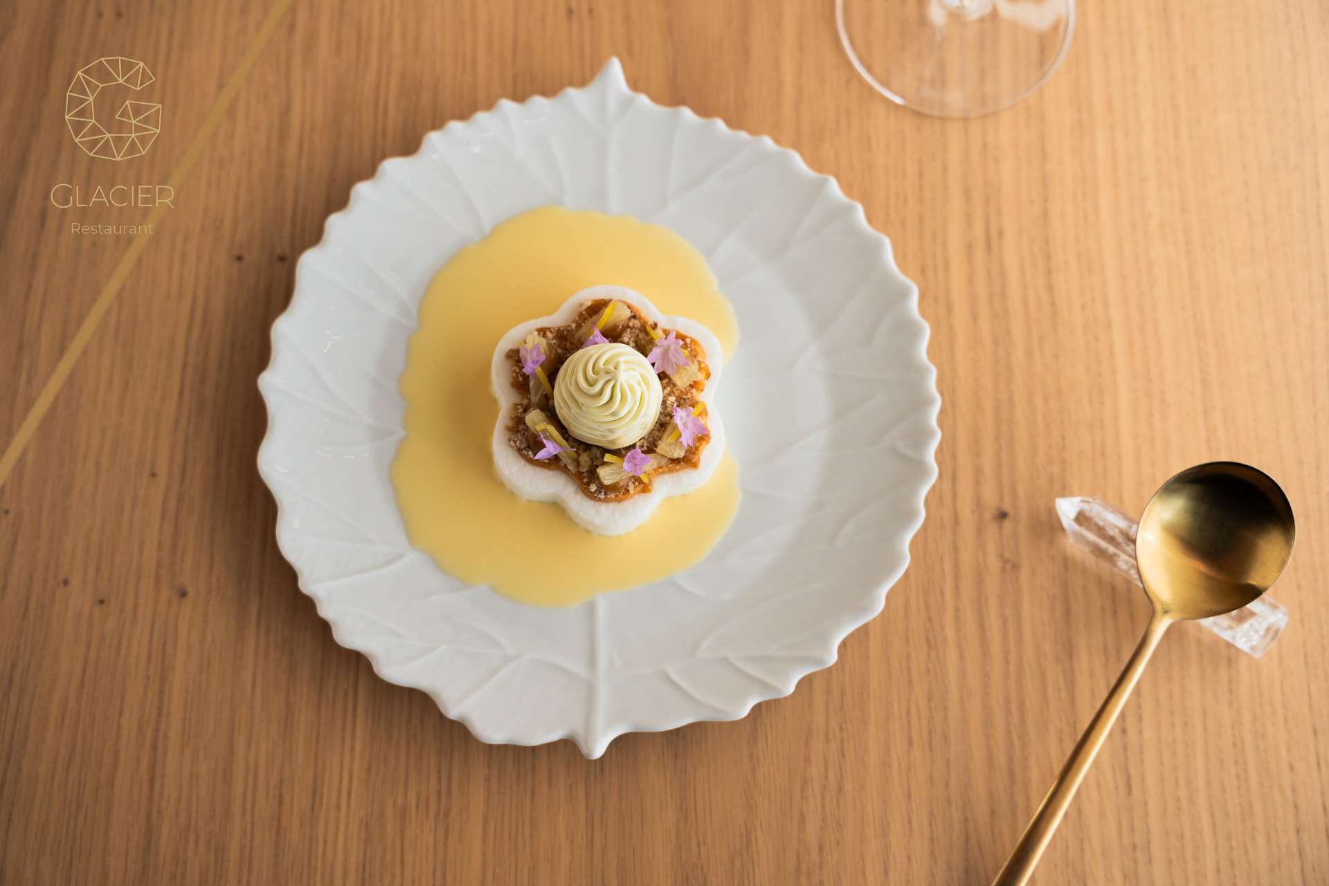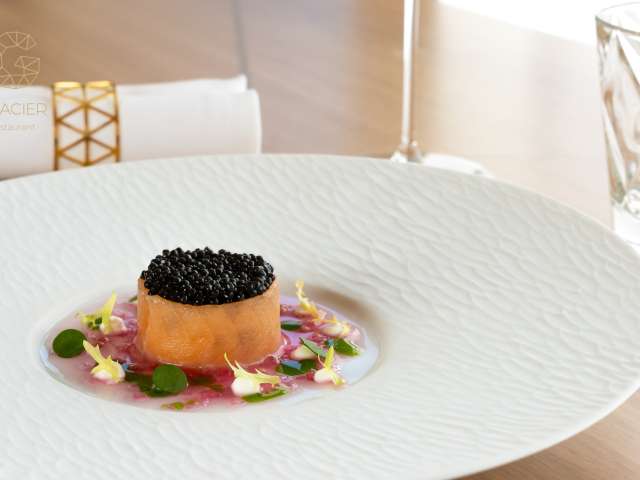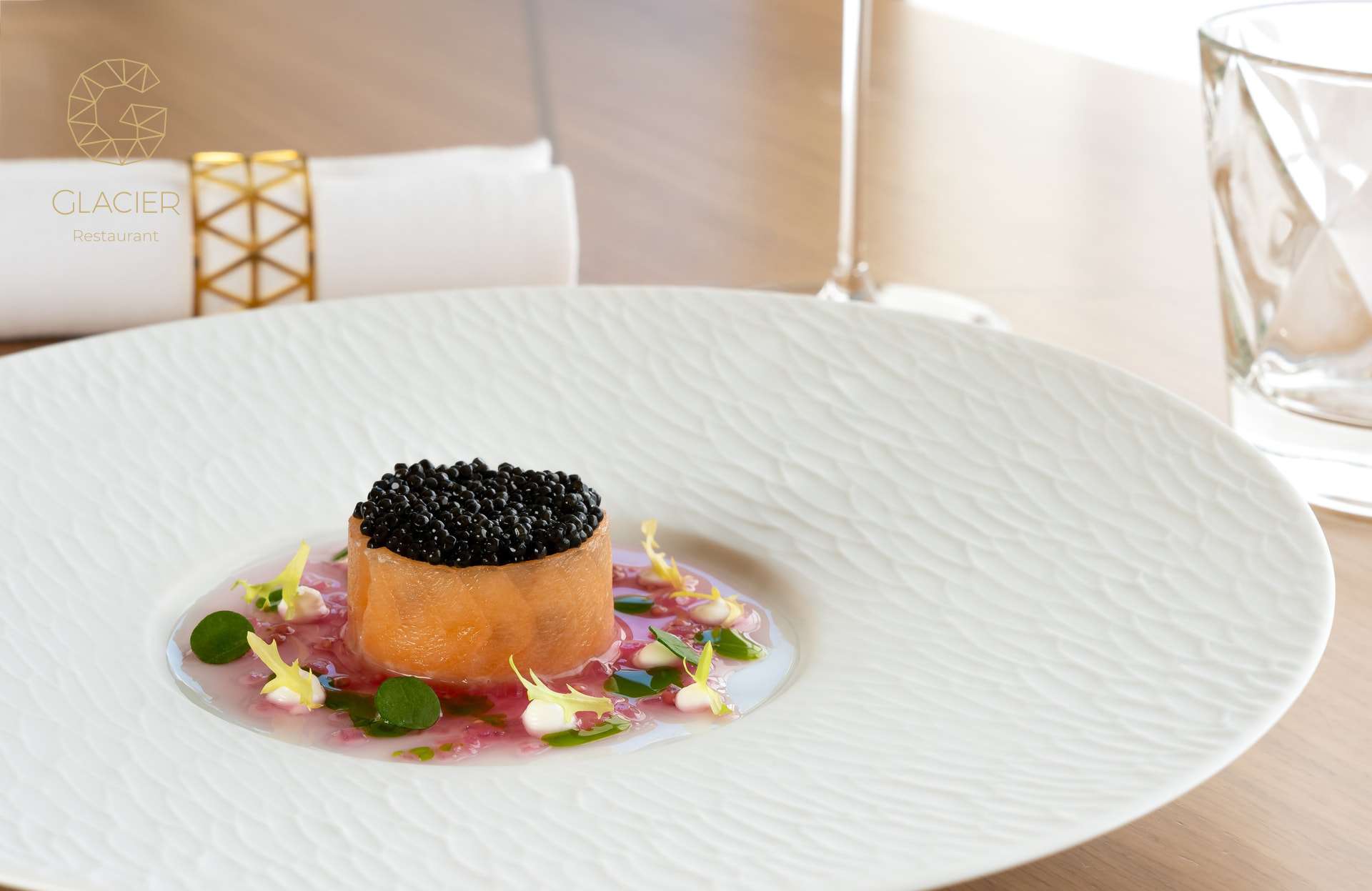 Indulge in a culinary journey at Restaurant Glacier, awarded 16 points at the GaultMillau, where our menu embodies a fusion of alpine tradition and French finesse. Chef Paul Cabayé’s vision guides our seasonal tasting menus, available in 5 or 7 courses, each meticulously crafted to showcase the vibrant flavors of the mountains.