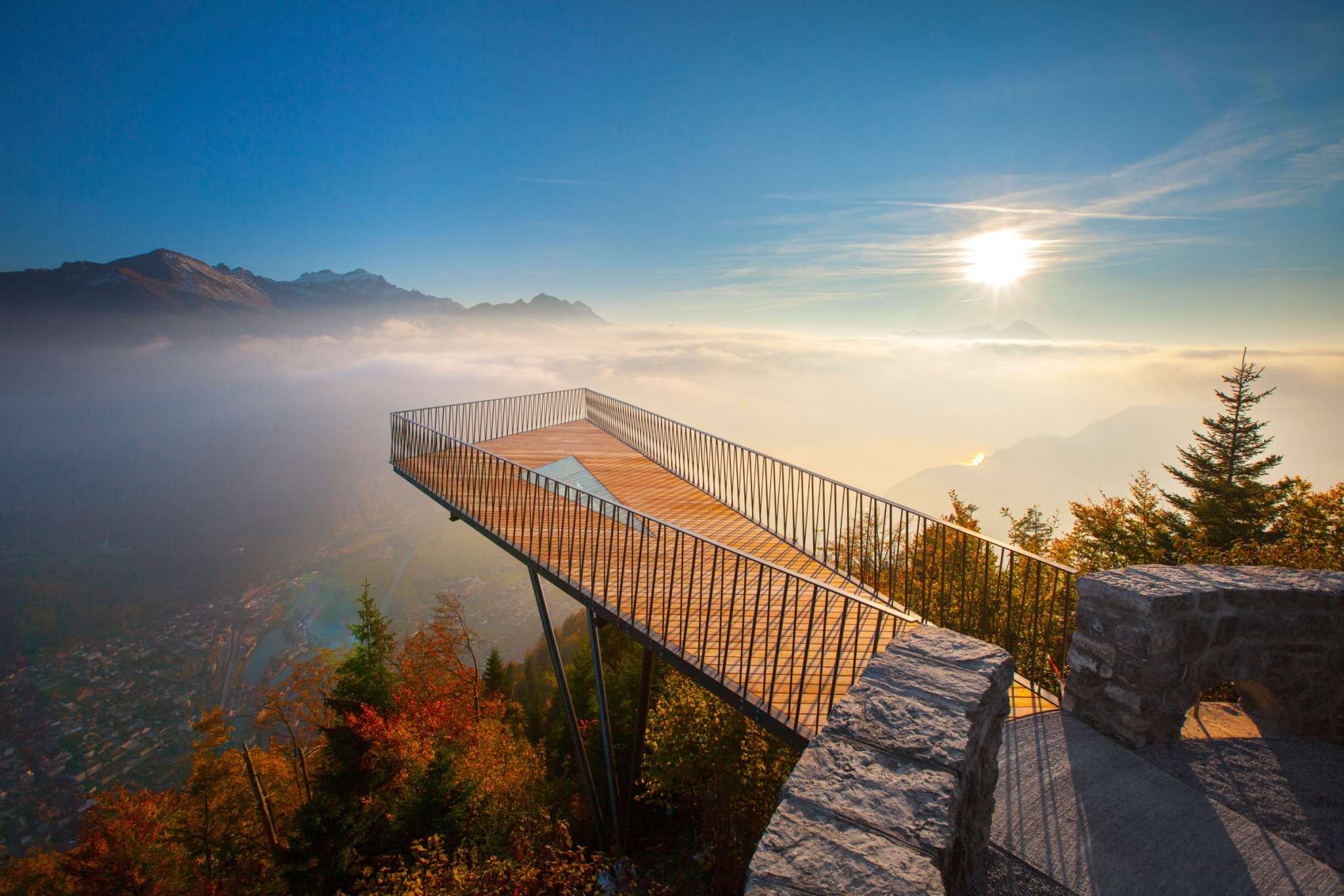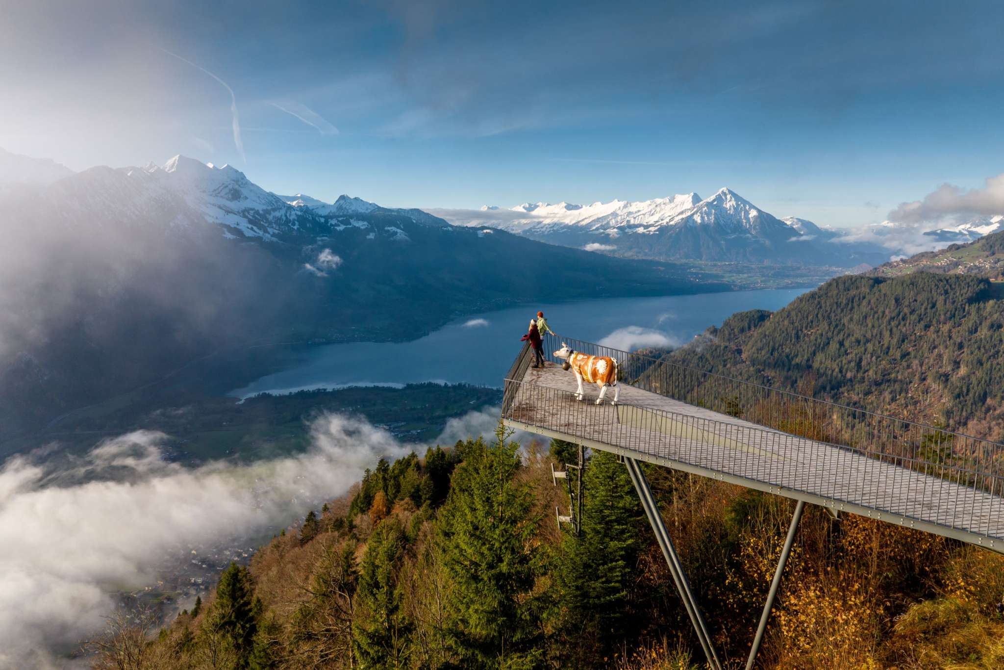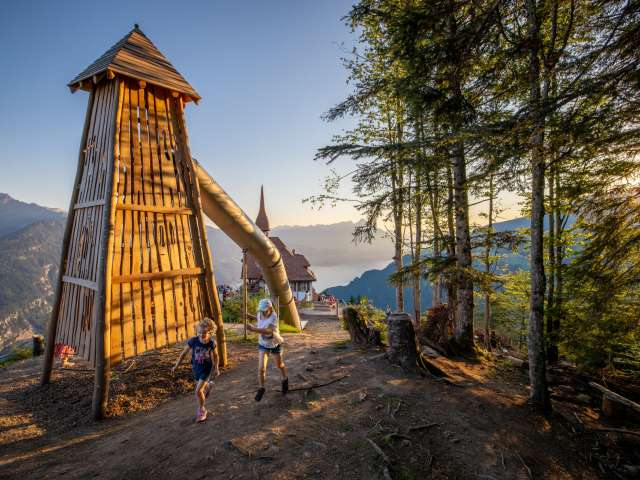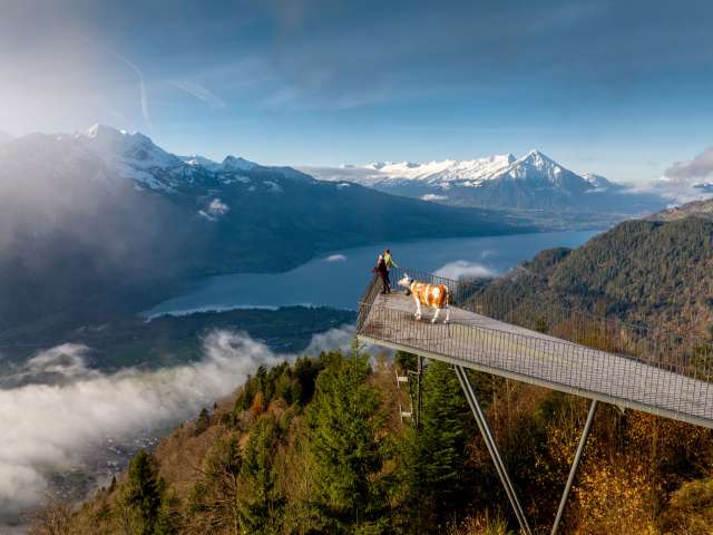 At the top, a breathtaking panorama unfolds: far below lies the «Bödeli» between Lake Thun and Lake Brienz, while on the horizon, the majestic trio of the Eiger, Mönch and Jungfrau captivates the view.