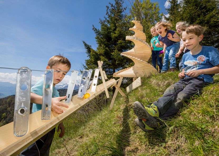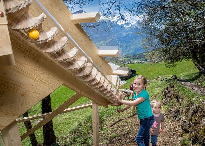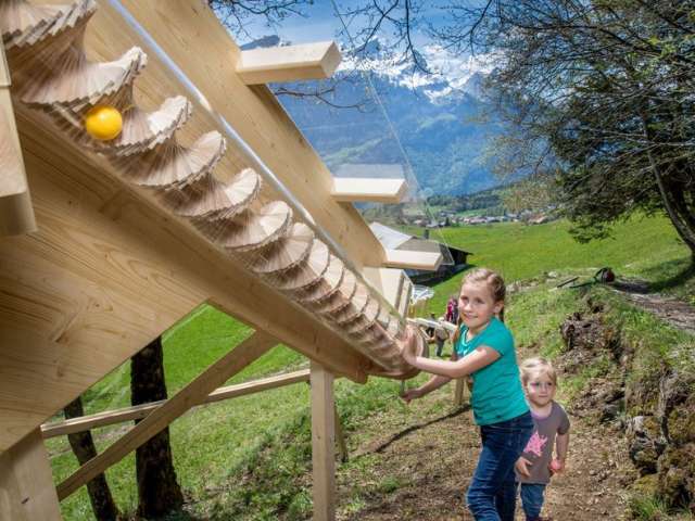12 exciting and varied marble runs await you along the hiking trail from the Bidmi middle station to the Reuti bottom station. The courses were built by local timber construction companies. It takes around an hour to walk from Bidmi to Reuti. The hiking trail is not suitable for pushchairs.