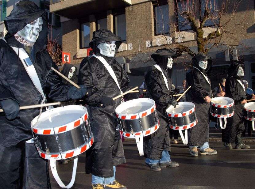 The name "Ubersitz" is another big talking point. Many tourists and foreigners speak of Übersitz because of their dialect, which makes a Hasler's hair stand on end! At the "Ubersitz", most Meiringen Trychler turn into a Wybervolk. In addition to the trycheln (bells), the front rows set the beat with drums. In front, the so-called "Huttewybli" pave the way for the procession. The history of the "Huttewybli" is