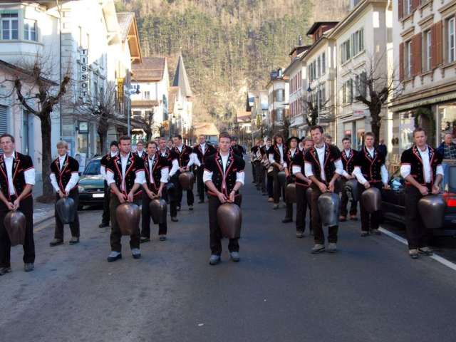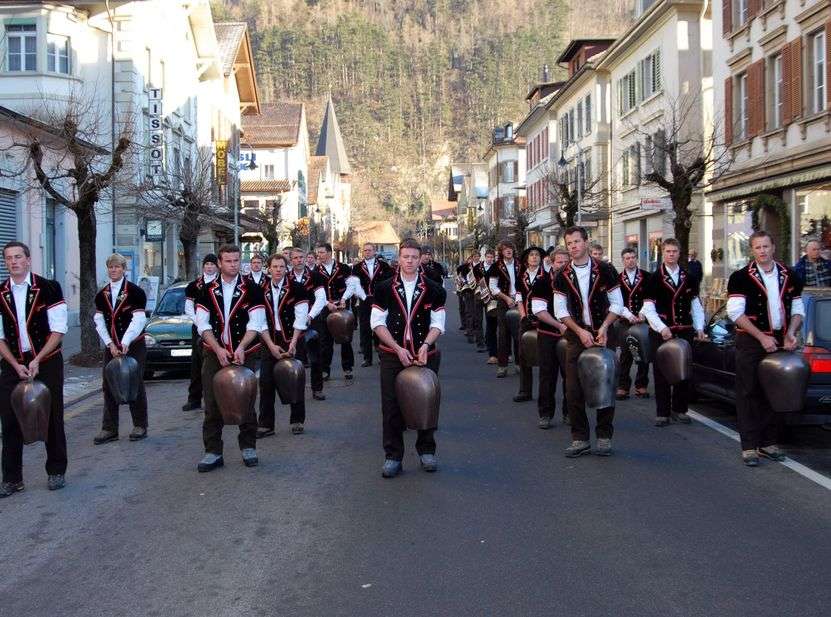 Depending on the village, the Trychler are masked and disguised or wear the "Mutz" (traditional costume waistcoat). Each village has its own procession and Trychelmajor. Even today, every Hasli Trychler knows that he has to drive away the evil spirits with his magical sounds, which follow a precise rhythm. However, this rhythm cannot be compared to a military march. It imperiously forces you to take a slow gliding step while the upper body rhythmically swings the bell or trychel. This nocturnal hustle and bustle goes up and down the street for hours. The Trychelmarsch has been in the blood of every true Oberhasler since childhood, so to speak. Although several thousand visitors from near and far fill the streets of Meiringen, the Old Year's Week cannot be compared to a carnival week or similar events with bell processions. Trychlen and the "Ubersitz" are and remain something unique.