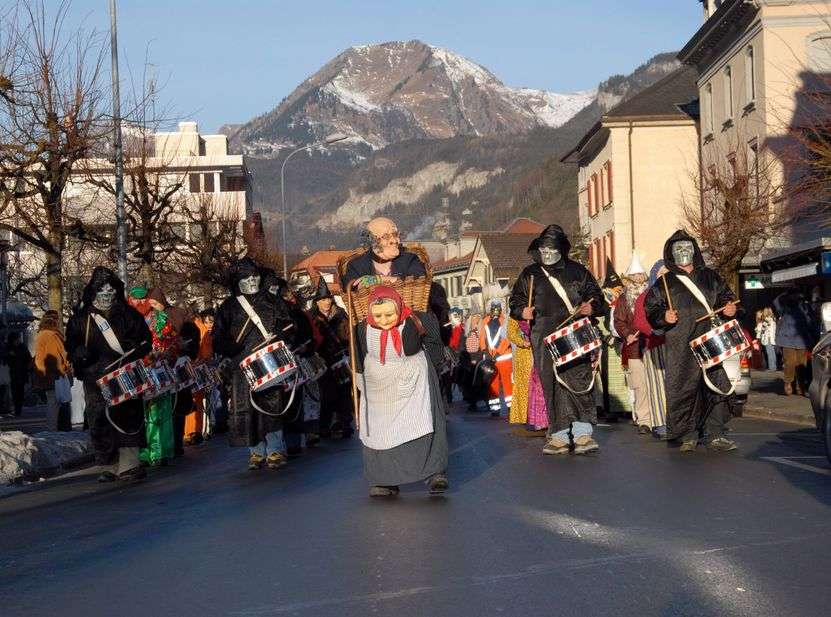 The people of Innertkirchen stay in their village over the "Ubersitz" within the Kirchet and travel from the "Ubersitz" to Meiringen the next morning on the 8.30 a.m. train (Meiringen-Innertkirchen railway). They stand out with their black Basel drums and the big, black beaky goat. They are also dressed up as "Boozeni".
