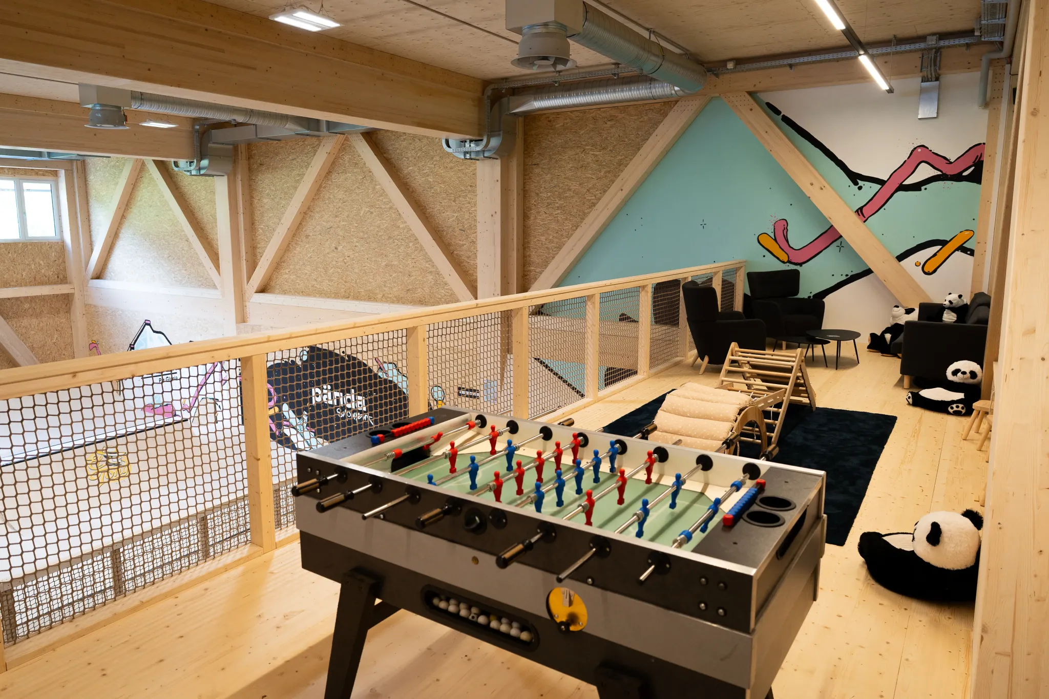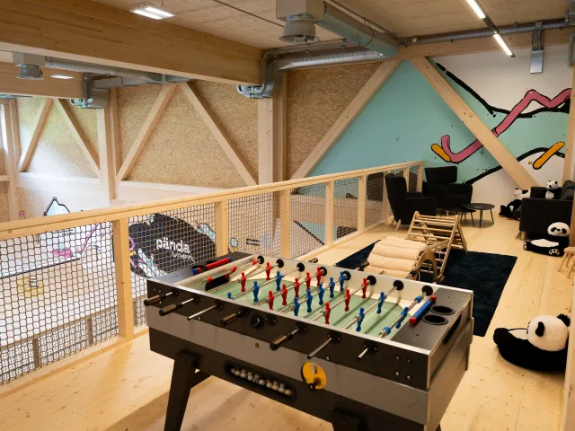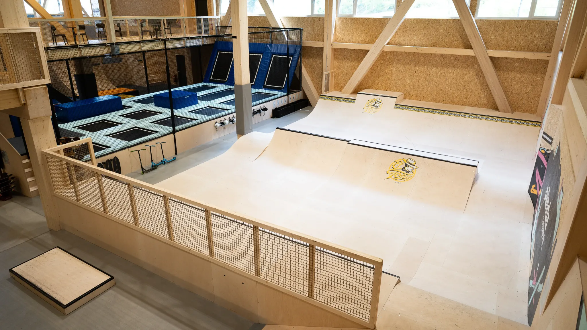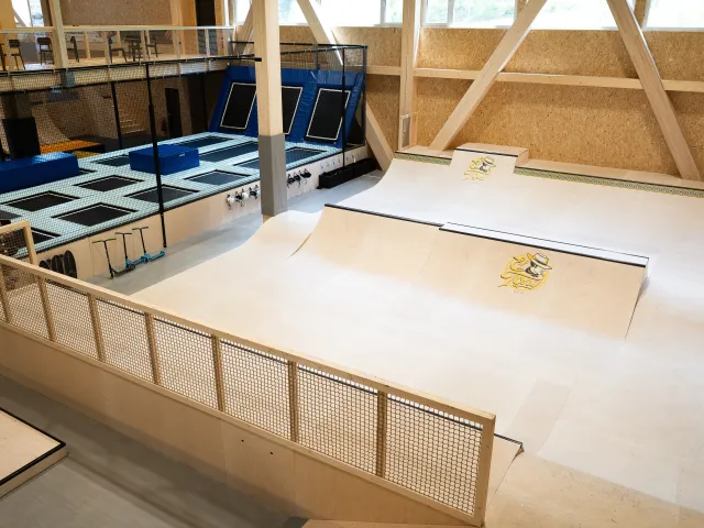 In addition to the trampoline and skating areas, there's a soft multisport zone ideal for yoga, workshops, parkour, and free movement. Spectators can enjoy a full view of the hall from the upper gallery, which includes a cozy bistro area. Kids can go all out while parents relax within sight. There’s something for the whole family to enjoy.