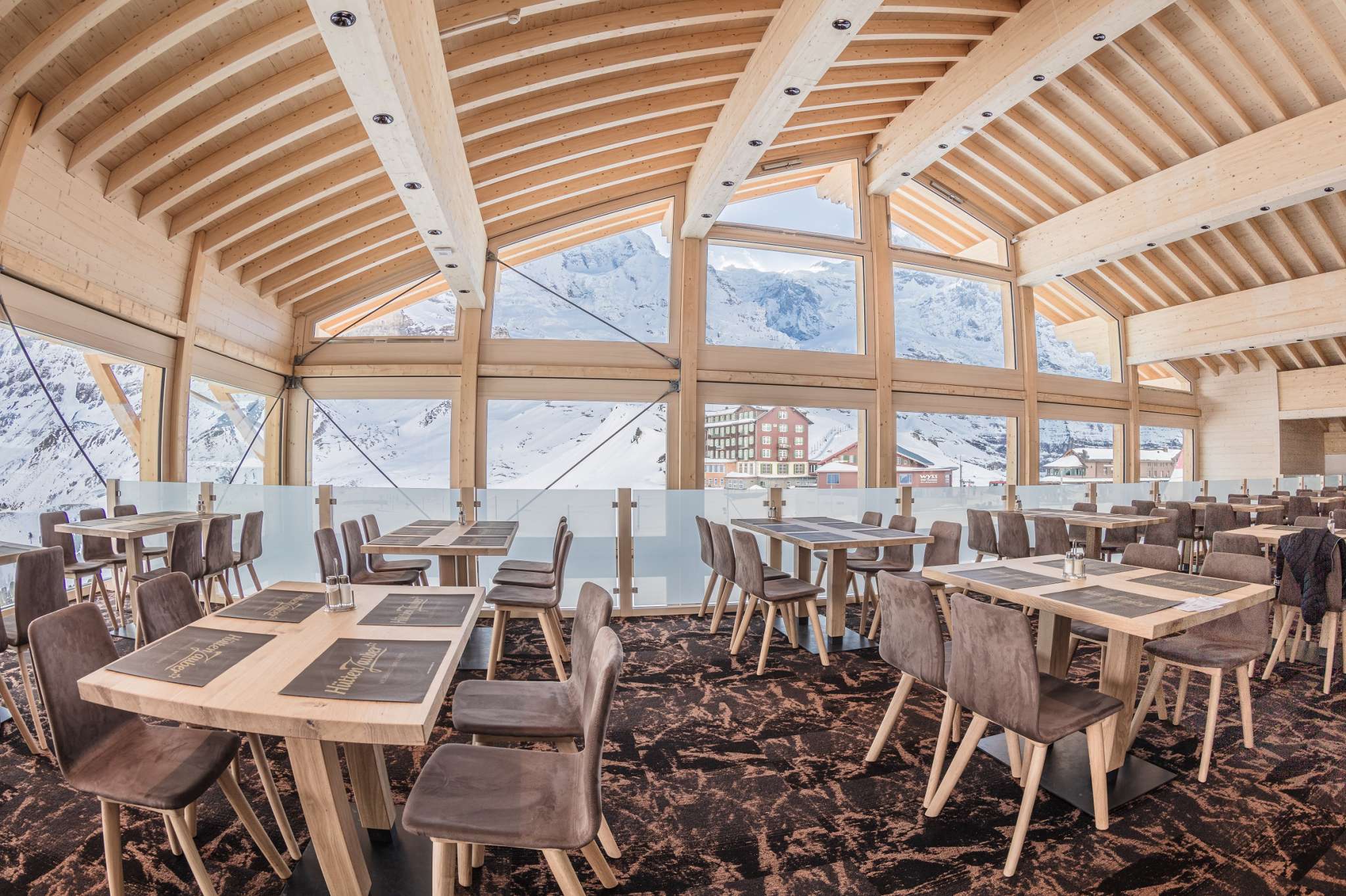 The establishment consists of a self-service and a serviced restaurant. Lots of wood combined with modern technology and lighting creates the perfect mix for a genuine Alpine chic experience. The menu consists of Swiss cuisine classics with a hut magic twist. The offer is complemented by a selection of Asian specialities.