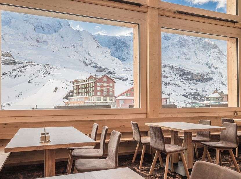 The generous window front allows you to catch a glimpse of the world-famous north face of the Eiger from every seat in the restaurant. The terrace surrounding the restaurant is bathed in glorious mountain sunshine all day long.