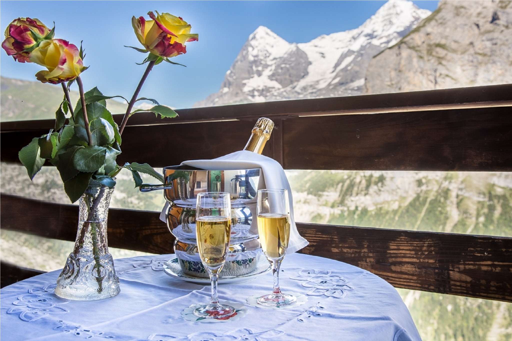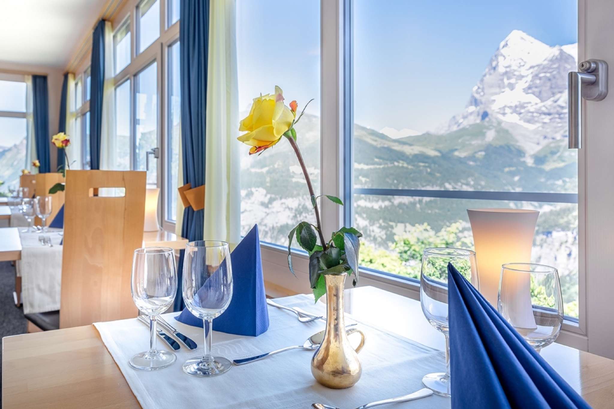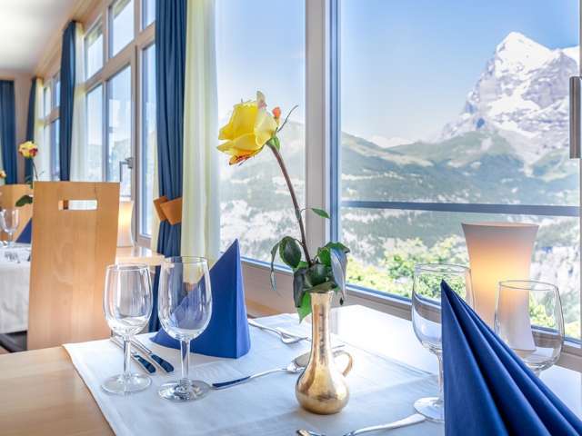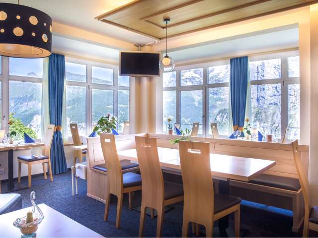 The restaurant at the Hotel Alpina has a spacious dining room where numerous national and international dishes are served. The delicacies can be savoured thanks to the large panoramic windows with a direct view of the Eiger, Mönch and Jungfrau.