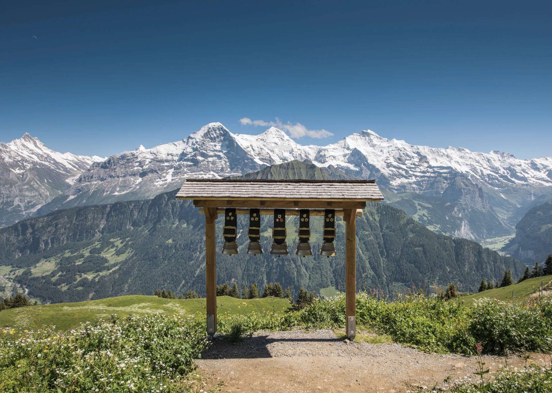 The viewing platform, opening in June 2025, offers breathtaking panoramic views of the Bernese Alps. During the short walk, the gaze wanders across blooming alpine meadows and impressive peaks – all the way down to Lake Thun far below in the valley.