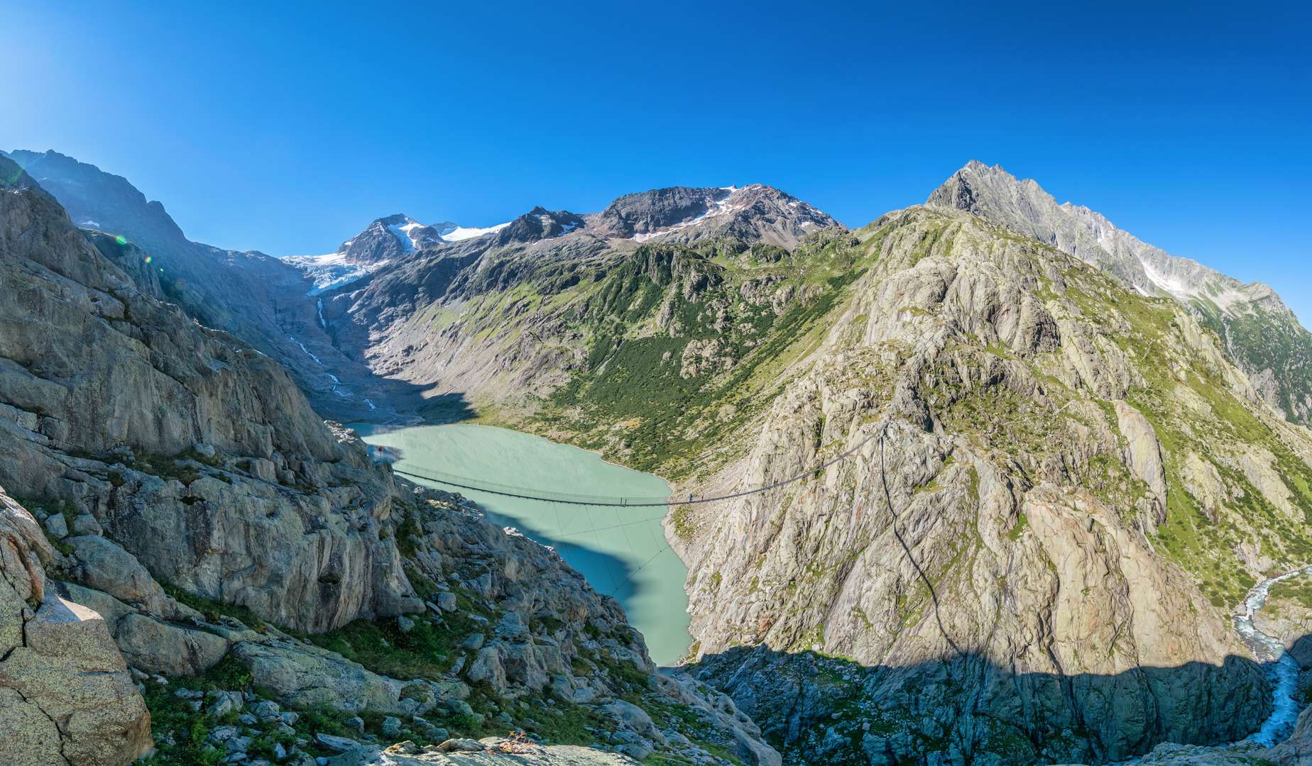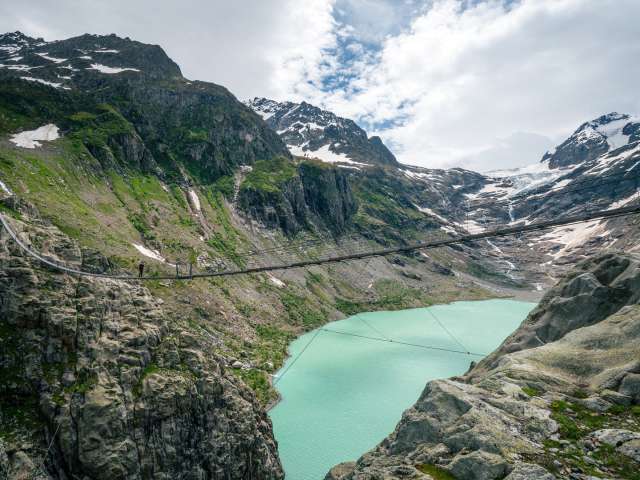 The 10-minute ride takes you over the Triftwasser river and up to the starting point for the 1.5-hours hike to the highlight of the Trift region – the Trift bridge.